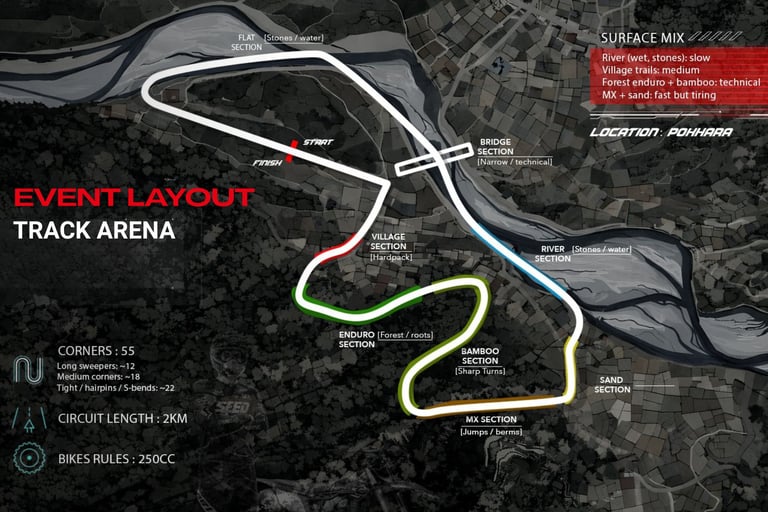 A high-intensity motorsport event combining endurance, technical terrain, and professional race standards — set against the natural landscape of Pokhara.